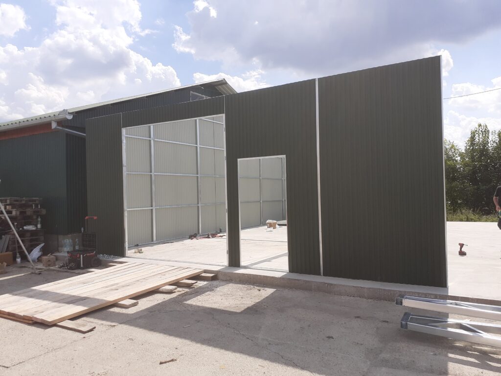 Nach dem Aufbau der Konstruktion werden die Wandbleche montiert. In der Regel handelt es sich dabei um hochwertiges Trapezblech, das je nach Ausführung horizontal oder vertikal angebracht wird.